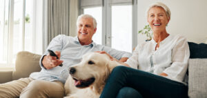 Retirement, relax and dog with couple on sofa while watching tv, movies or streaming service. Happy, love and pet with old man and elderly woman in living room at home for lifestyle together