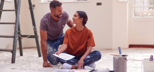 Couple Sitting On Floor With Paint Chart Ready To Decorate New Home