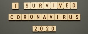 I SURVIVED CORONAVIRUS 2020 – words from wooden blocks with letters. Top view on gray background. – Image