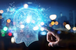 Businessman on blurred background creating artificial intelligence 3D rendering