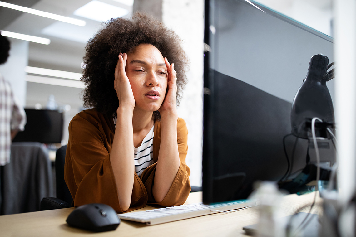 Overworked and frustrated young woman in front of computer in office