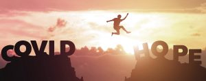 Silhouette man jumps to survive from corona virus , COVID-19. Th