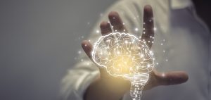 Virtual reality man with symbol neurons in brain.creative idea.C