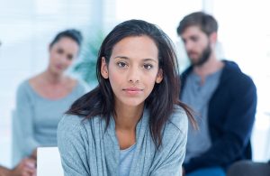 Woman comforting another in rehab group at therapy